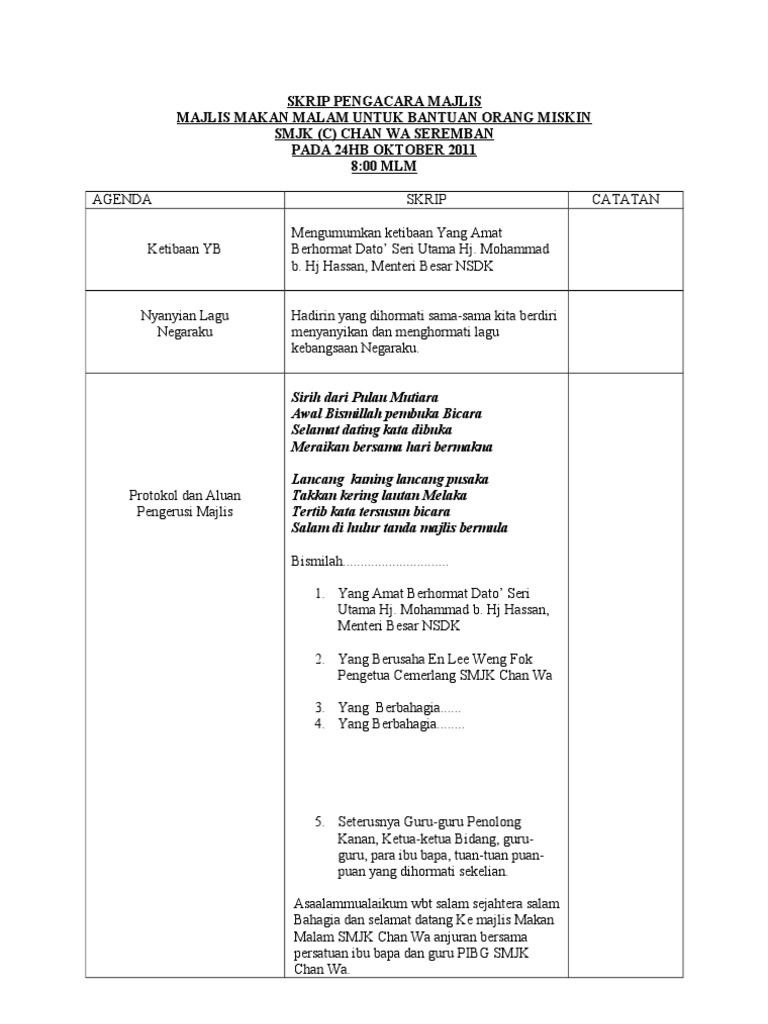 Skrip Pengacara Majlis Makan Malam : Untuk melihat detail lagu skrip pengacara majlis penyampaian hadiah klik salah satu judul yang cocok, kemudian untuk link download skrip.. Contoh ucapan pengacara majlis mc bagi majlis makan malam tips tips untuk mengacara majlis sebagai mc. Untuk melihat detail lagu skrip pengacara majlis penyampaian hadiah klik salah satu judul yang cocok, kemudian untuk link download skrip. Majlis makan malam kolej burhanuddin helmi 19 mei 2016. Skrip pengacara majlis oracle think camp. 2013 skrip pengacara majlis anugera.