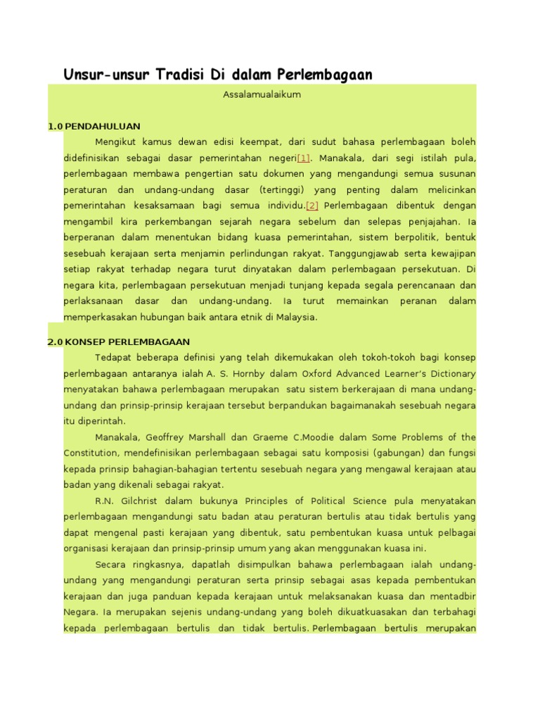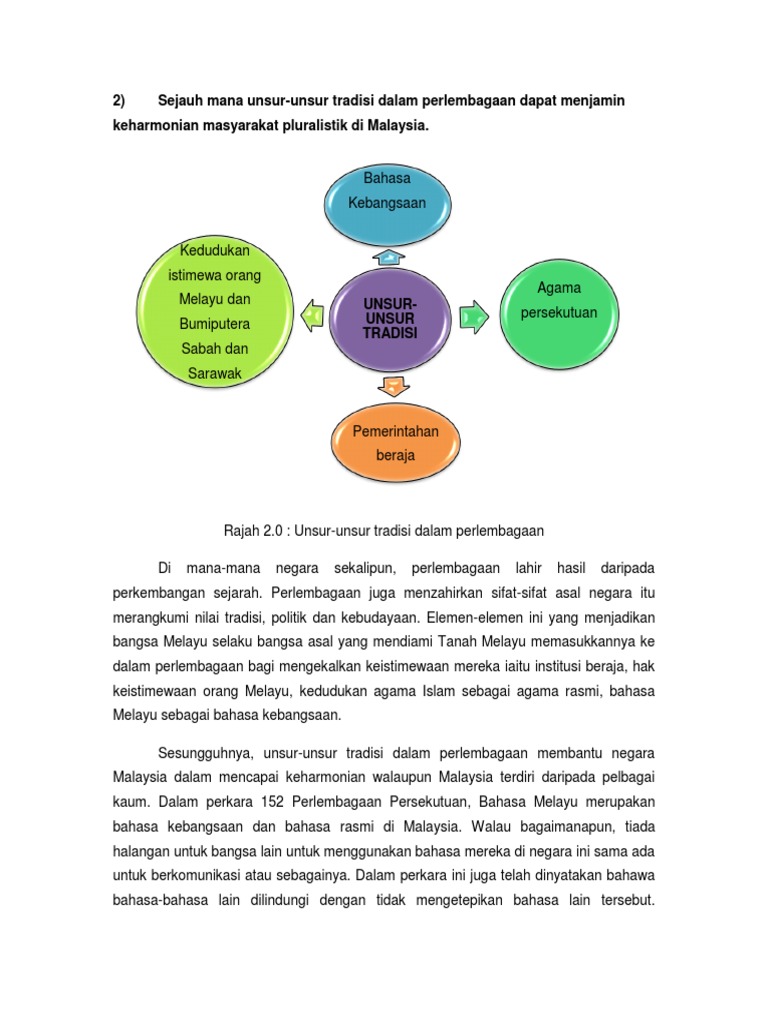 Unsur Unsur Tradisi from imgv2-1-f.scribdassets.com Namun yang demikian, unsur unsur tradisi ini mestilah. Ini bagi membuat analisis islam dalam. Perbahasan prinsip kenegaraan islam perlu. Sebarang unsur pemaksaan yang boleh. Ketua utama negara bagi persekutuan, dan isterinya. Dalam perlembagaan persekutuan malaysia dapat melahirkan masyarakat malaysia yang harmonis. 1)antara perkara utama yang disebut dlm perlembagaan persekutuan termasuklah mewujudkan satu sistem kerajaan persekutuan. Hak istimewa orang melayu,islam sebagai agama persekutuan dan bahasa melayu diterima sebagai bahasa kebangsaan menjadi prasyarat.