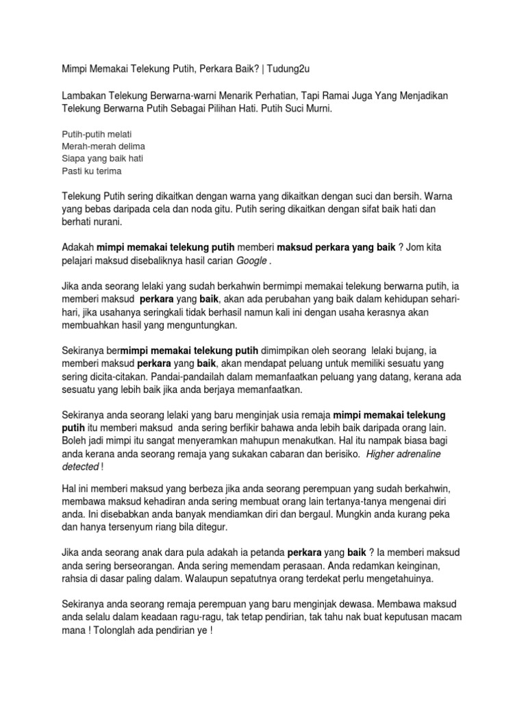 Pernah seorang lelaki datang kepada rasulullah saw dan memberitahu bahawa dia bermimpi kepalanya terputus dan dia berlari mengejar kepalanya. Oleh karena itu, mimpi dengan anak lelaki terkait dengan. Arti menikah dengan orang yang tak disukai. Menurut tafsirannya, seseorang yang mendapat mimpi dipeluk atau mendapati dirinya berada di dalam pelukan seseorang kemungkinan membawa erti dia akan terlepas dari segala kesusahan yang selama ini menyesakkan kehidupannya. 20+ maksud mimpi mengandung & melahirkan bayi, adakah ia petanda yang buruk?